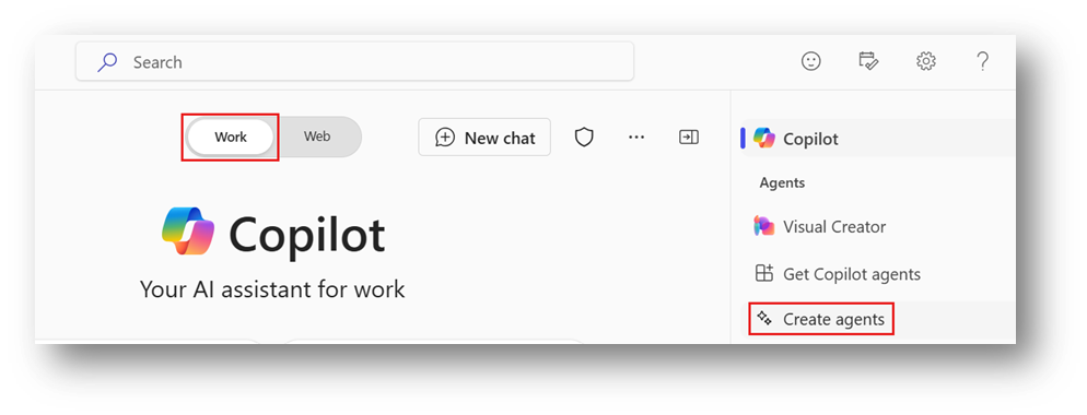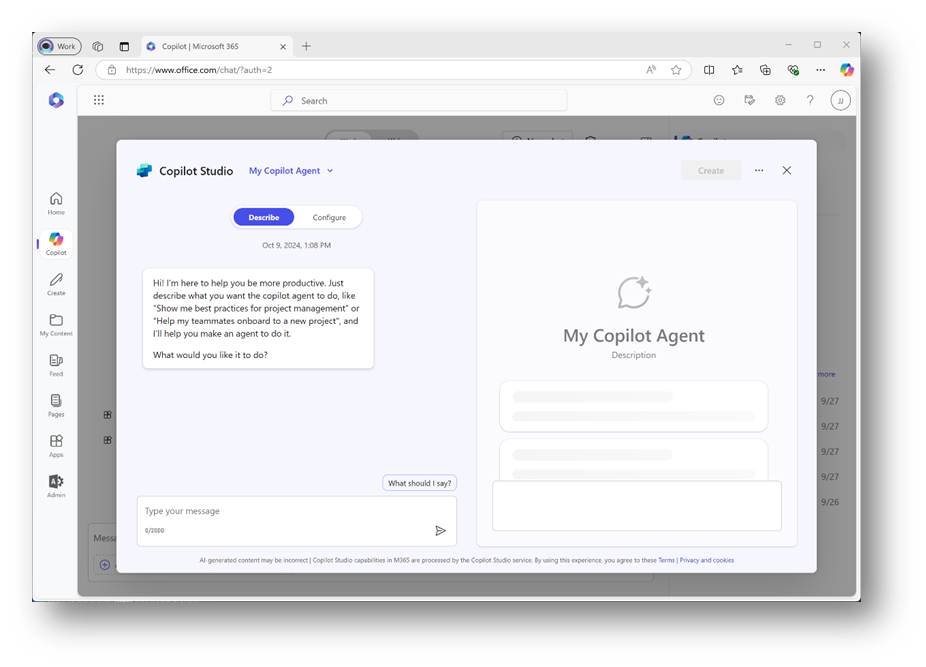 Microsoft 365 Copilot Studio lets organizations create custom agents that use enterprise data, automate tasks, and enhance experiences in Microsoft 365 apps. Its extensibility supports integration with external systems, workflow customization, and multi-step task automation, all within security and compliance standards. The image below highlights M365 Copilot Studio “Lite”. This is one of the ways to create an AI Agent. This also reminds us to use the Work tab when building agents or working with organizational data.